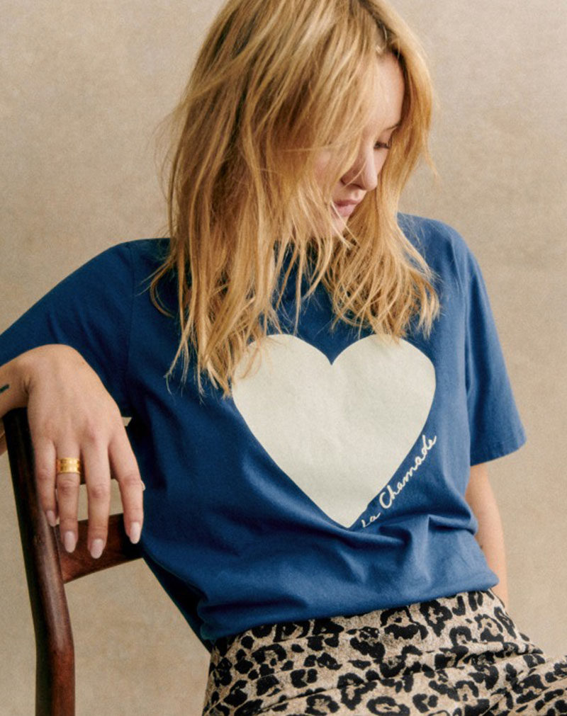 24年春夏法式小众复古蓝色纯棉T恤爱心印花短袖圆领宽松百搭上衣