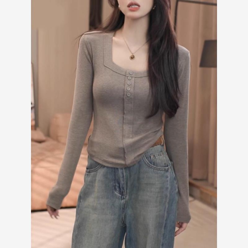 高级感方领灰色长袖t恤女装秋季2025新款大码胖MM修身打底衫上衣