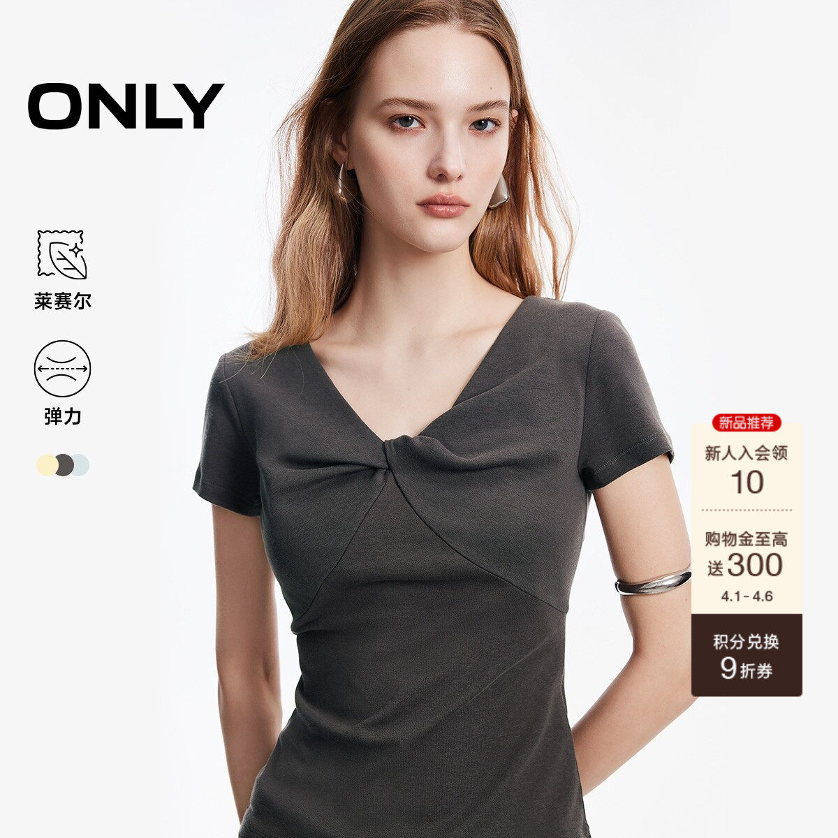 ONLY2026春季新款莱赛尔蝴蝶结V领修身纯色舒适弹力正肩T恤上衣女
