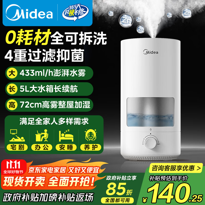 美的(Midea)空气加湿器大雾量家用卧室取暖补水仪小型净化除菌喷雾器宿舍实用超声波雾化器国家补贴SC-3D50