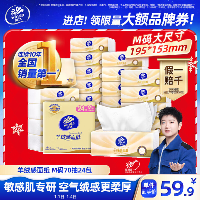 维达(Vinda)抽纸 羊绒感面纸70抽*24包M码 敏感肌适用 卫生纸纸巾 纸抽整箱