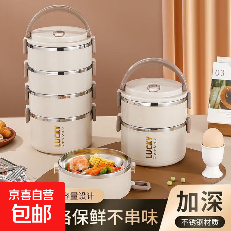 京东物流 大容量双层保温饭盒 加厚不锈钢便携密封便当收纳盒 【三层】米白色