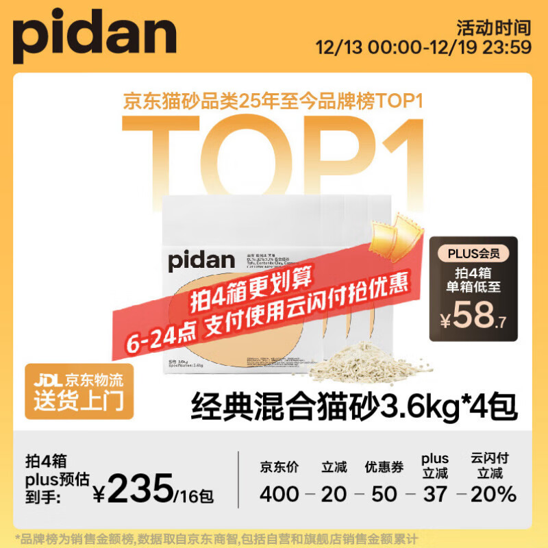 pidan混合猫砂 豆腐膨润土木薯60%:30%:10%混合3.6kg*4包