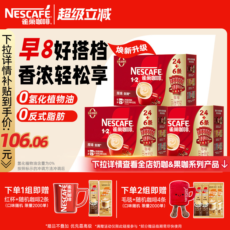 雀巢咖啡1+2原味90条特浓三合一拿铁速溶咖啡雀巢官方旗舰店