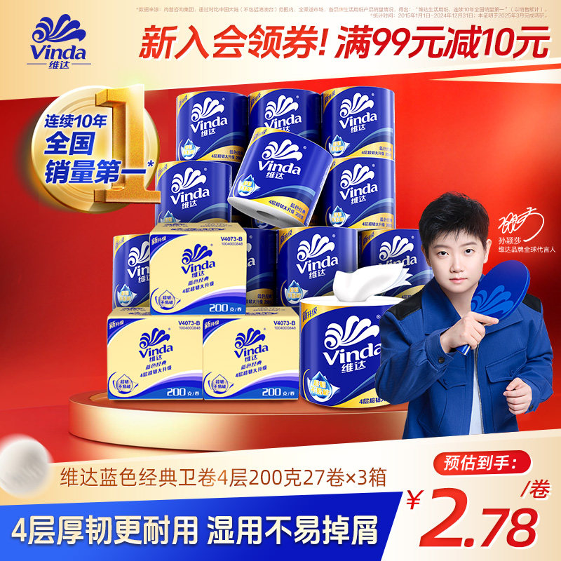 【进直播间享加赠】维达蓝色经典有芯卫生纸4层200g卷纸厕纸箱装