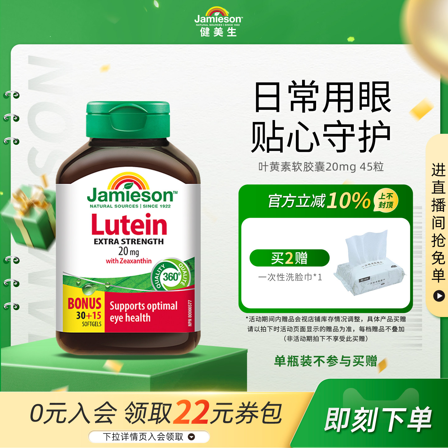 Jamieson健美生叶黄素20mg 软胶囊45粒呵护双眼玉米黄质1000mcg