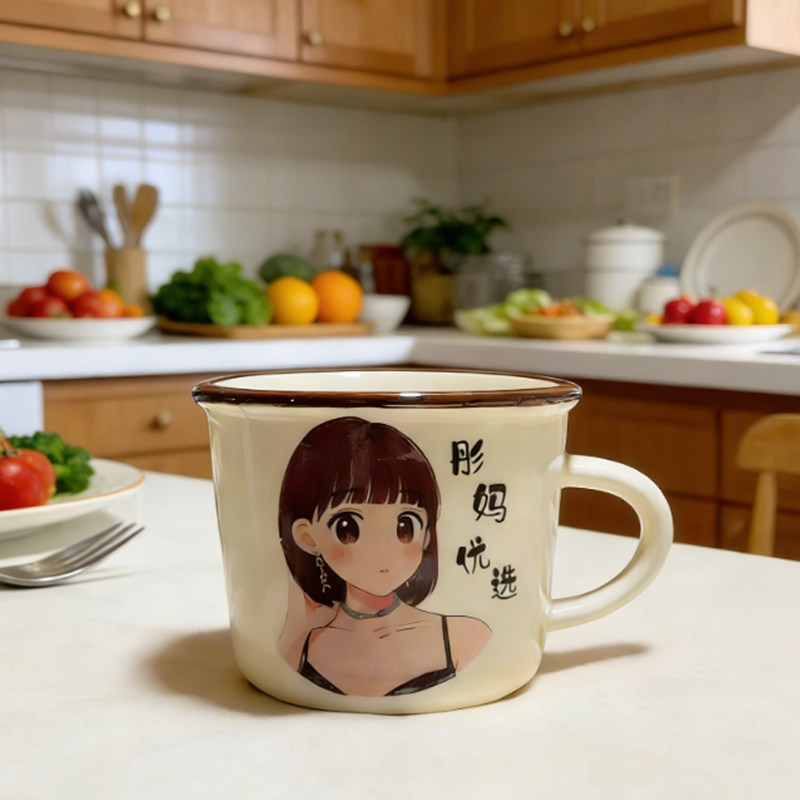 【彤妈】T新款米黄陶瓷水杯创意家用卡通喝水咖啡牛奶杯