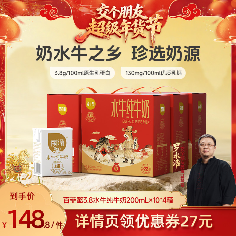 【交个朋友年货节】百菲酪3.8g水牛纯牛奶10盒*4箱