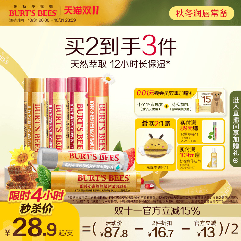 伯特小蜜蜂皇牌润唇膏女保湿补水防干裂口红可用burtsbees旗舰店5¥28.92元¥43.90 天猫 天猫伯特小蜜蜂旗舰店