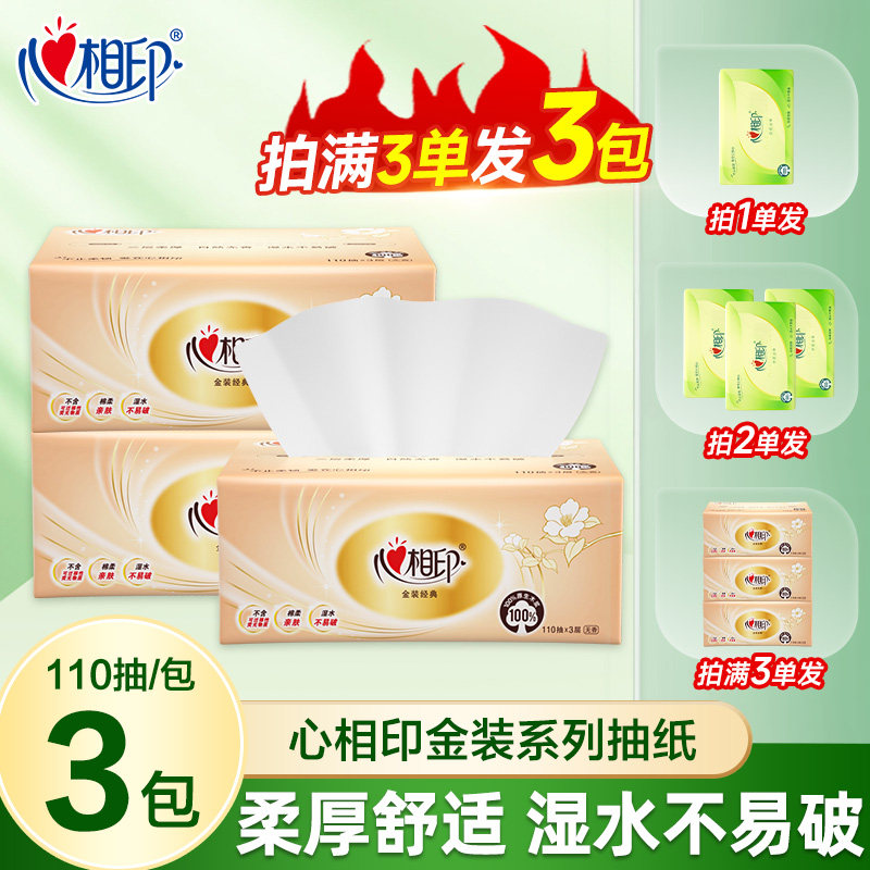 心相印经典抽纸110抽三层加厚一分购两元纸亲肤可湿水家用实惠装Z