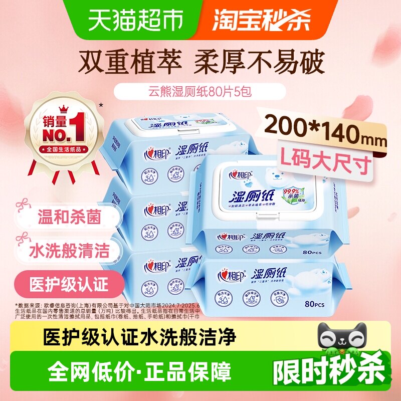 【田栩宁推荐】心相印湿厕纸家庭擦屁屁湿纸巾洁厕巾80片*5包
