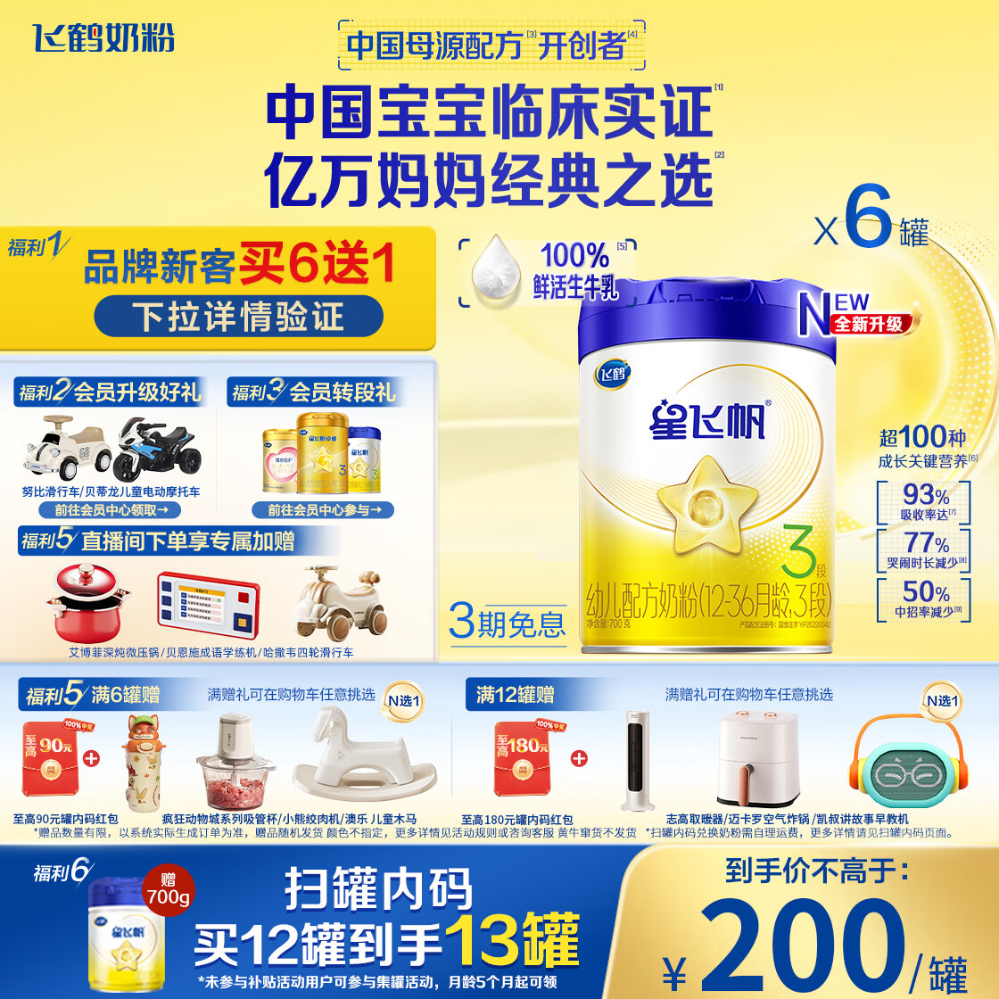 飞鹤星飞帆 婴幼儿配方奶粉3段(1-3岁) 700g*6 专利OPO 育儿补贴