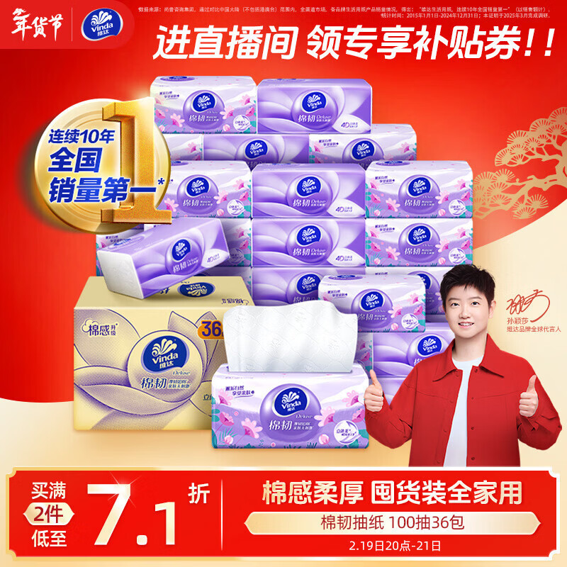 维达(Vinda)抽纸【孙颖莎推荐】棉韧3层100抽*36包S码 亲肤无刺激纸巾 AB混发