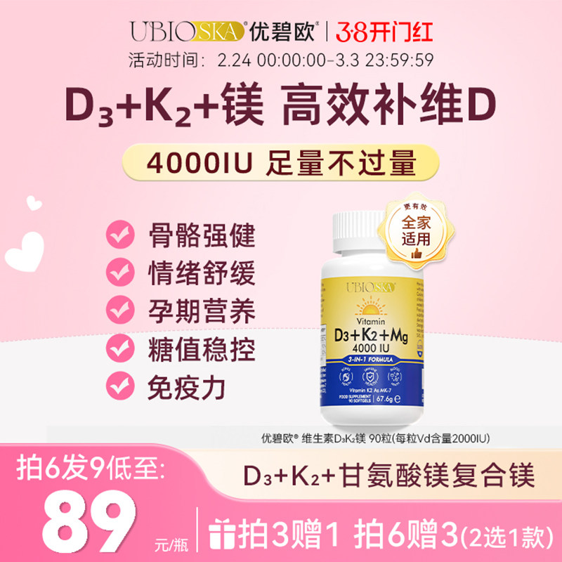 UBIO优碧欧维生素d3k2镁三合一儿童维生素D3K2000iu镁孕妇成人d3