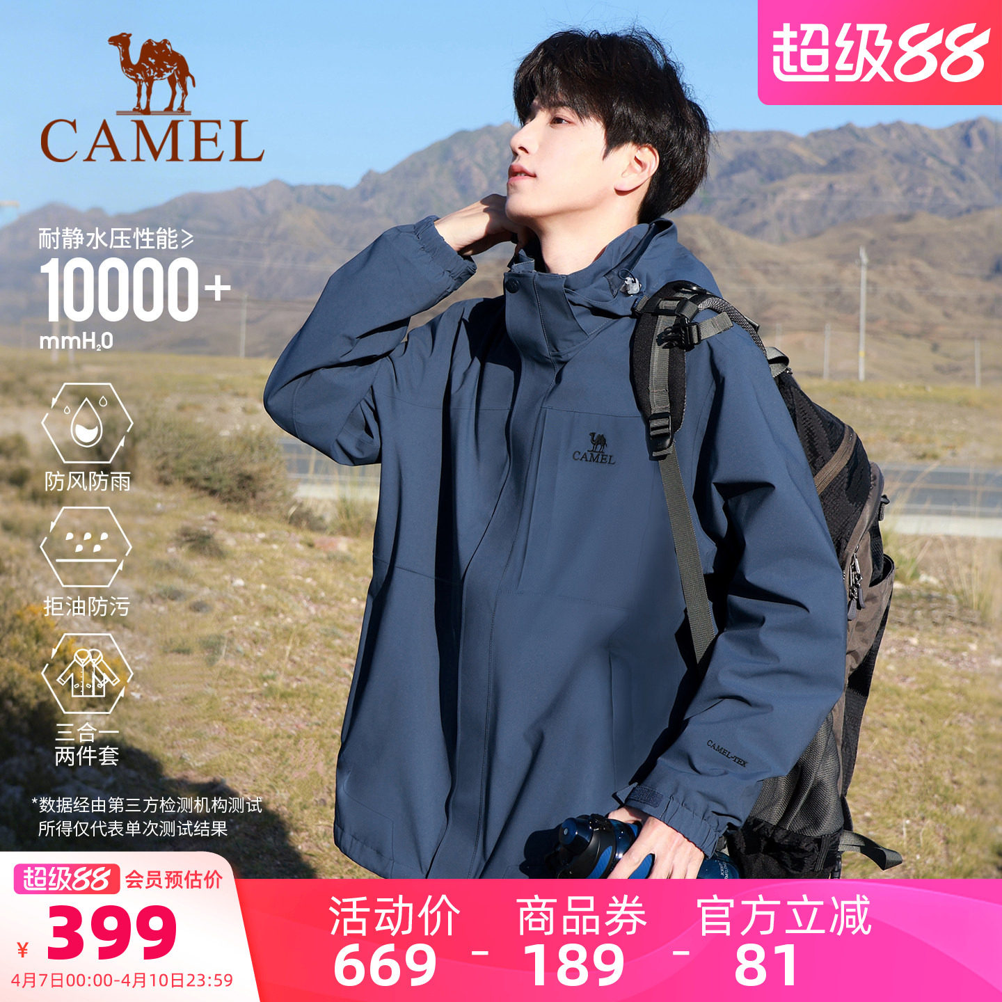 骆驼户外灰湛蓝色冲锋衣男三合一暴雨防水防风外套徒步登山服装女