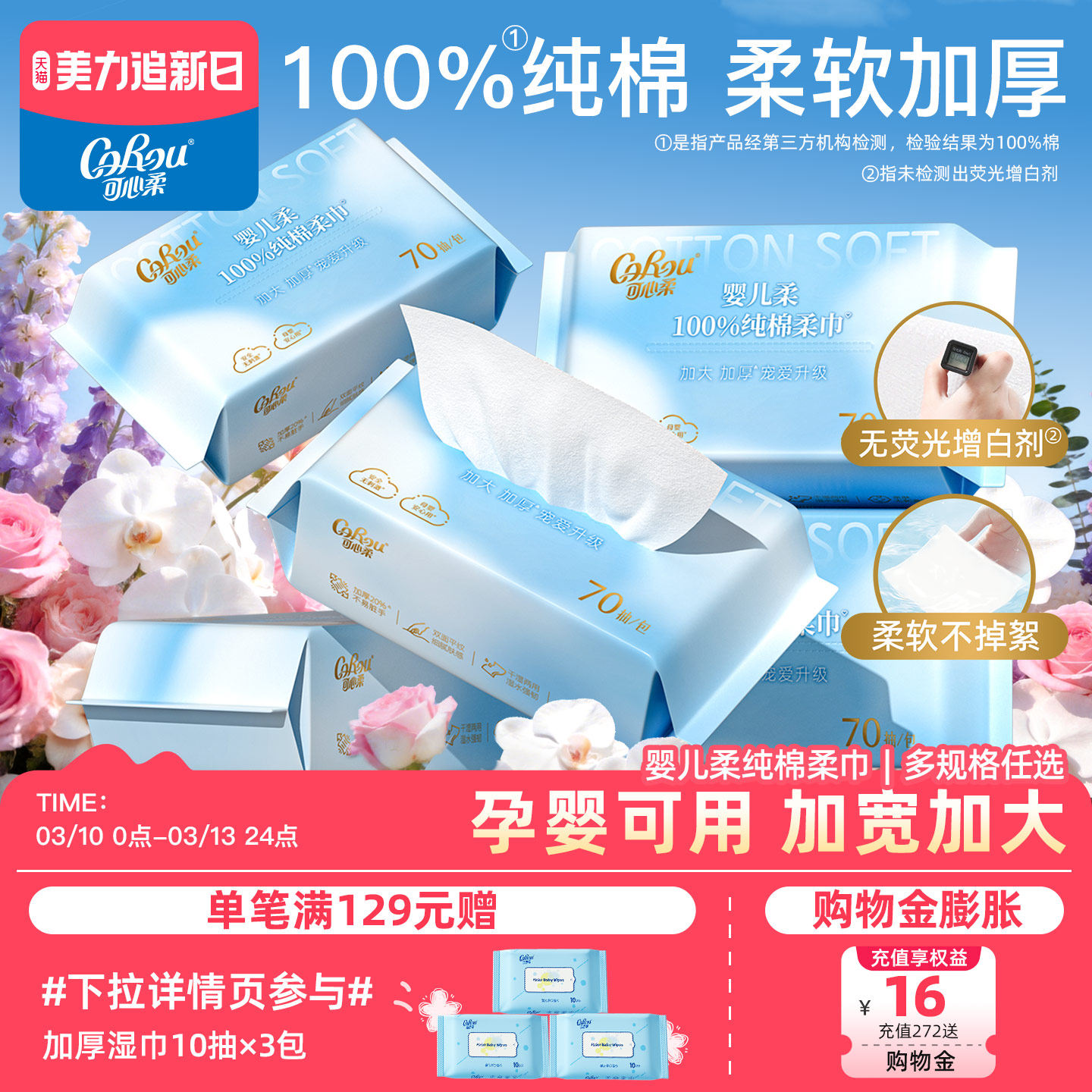 可心柔纯棉洗脸巾全棉棉柔巾婴幼儿专用擦脸巾加厚柔软一次性70抽