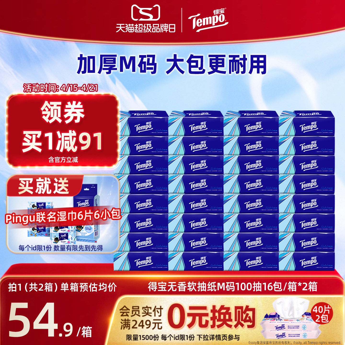 Tempo得宝抽纸4层加厚100抽16包/箱*2箱餐巾纸家用大包家庭用纸巾