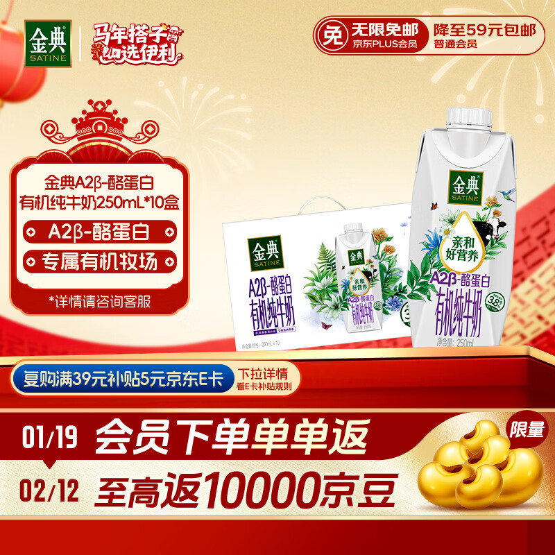 伊利金典 A2β-酪蛋白有机纯牛奶整箱250ml*10盒 年货礼盒装