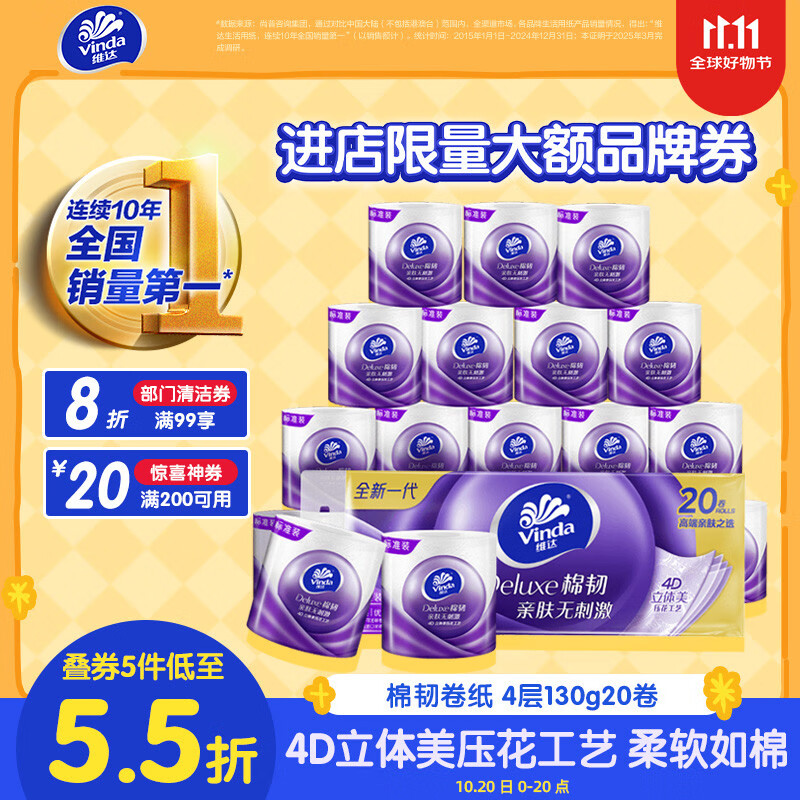 维达(Vinda)有芯卷纸 棉韧4层130克*20卷 亲肤无刺激 卫生纸 卷筒纸纸巾 厕纸