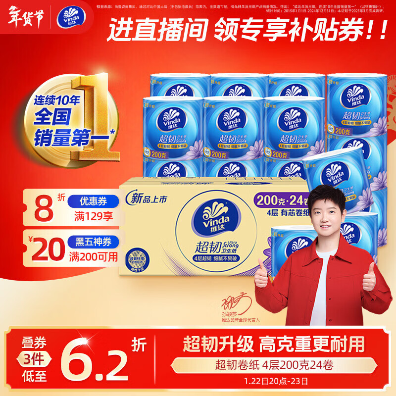 维达(Vinda)有芯卷纸【孙颖莎推荐】超韧4层200克*24卷 高克重卫生纸厕纸整箱