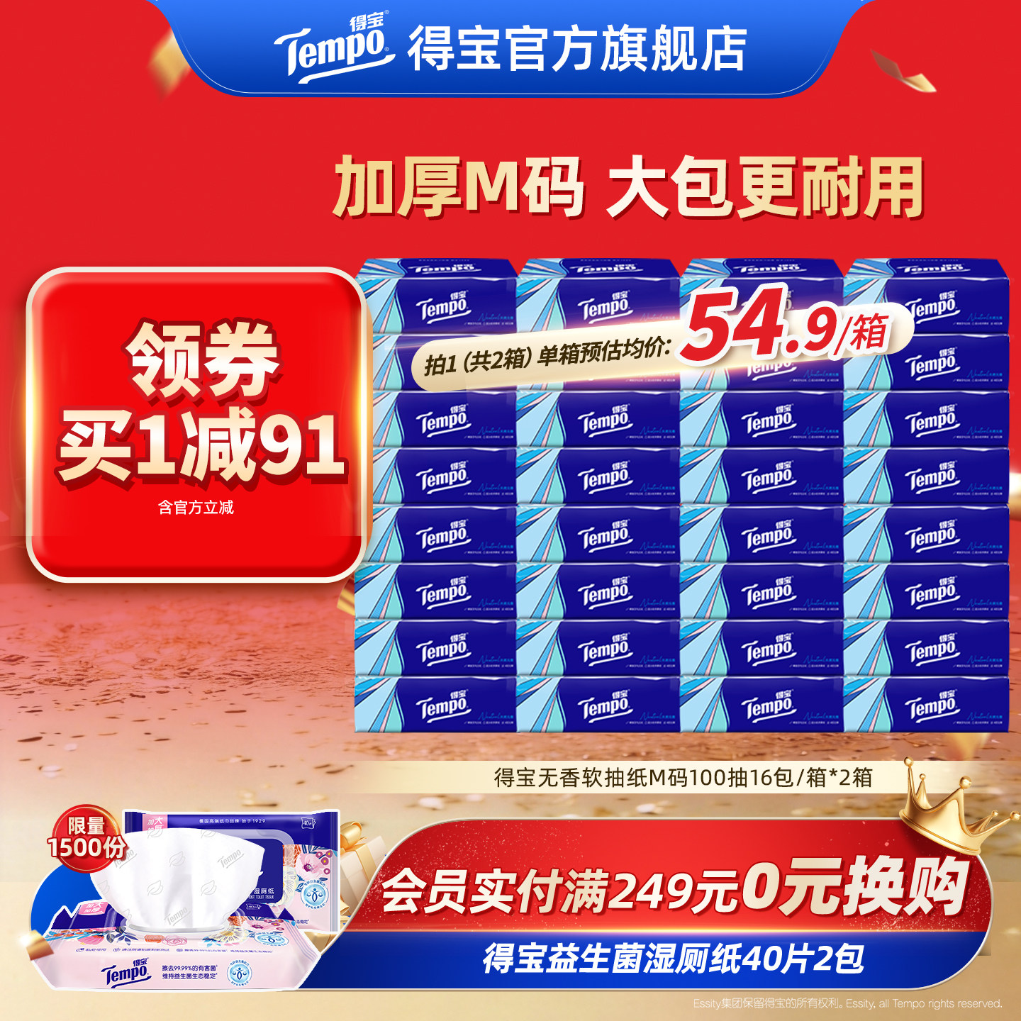 Tempo得宝抽纸4层加厚100抽16包/箱*2箱餐巾纸家用实惠装整箱大包