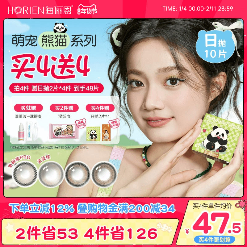 [买4赠4]海俪恩萌宠熊猫美瞳日抛10片彩色隐形眼镜大直径锁边果赖