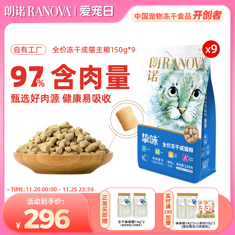 朗诺主食冻干猫主粮鸡肉三文鱼兔肉口味猫粮150g*9袋