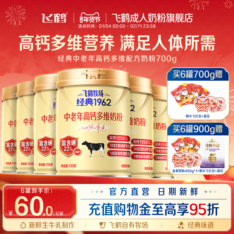 飞鹤经典1962中老年高钙多维奶粉900g*6罐加锌铁钙全家营养奶粉
