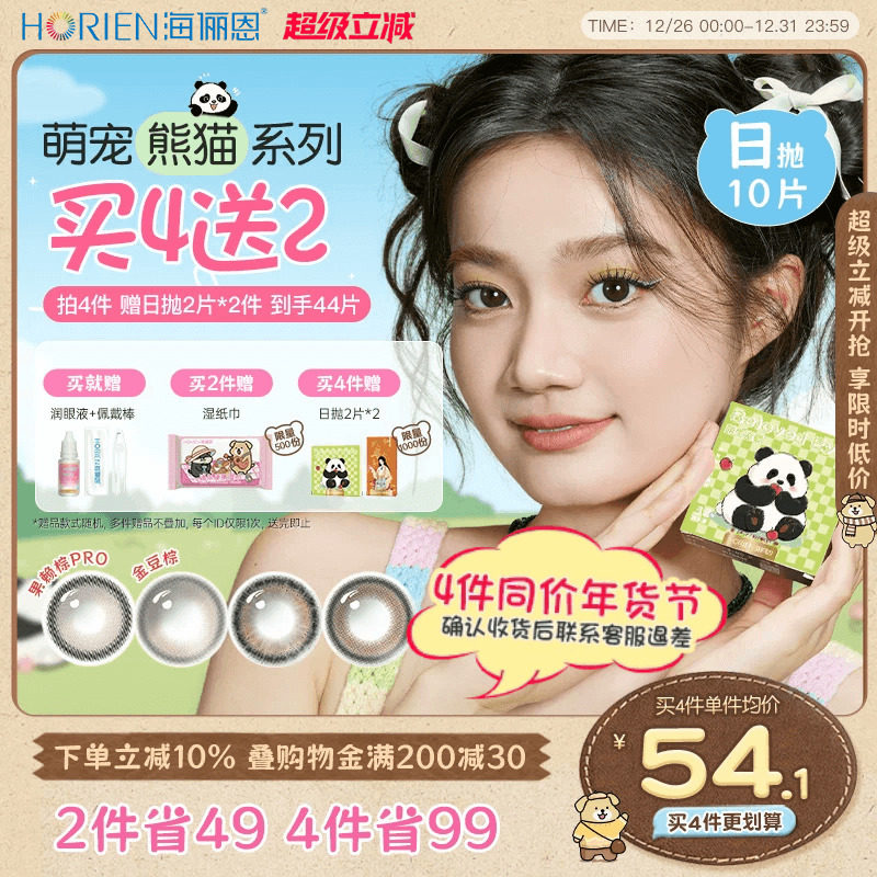 【买4赠2】海俪恩萌宠熊猫美瞳日抛10片彩色隐形眼镜大直径果赖棕
