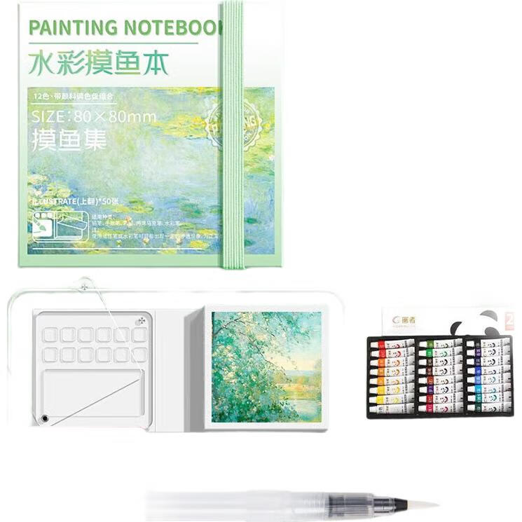迷你水彩颜料盒小本子 亚克力水彩颜料随身携带小画板小画本固体水彩便携写生旅行水彩绘画套装本 【绘画套装】12格摸鱼本+24色颜料+水笔