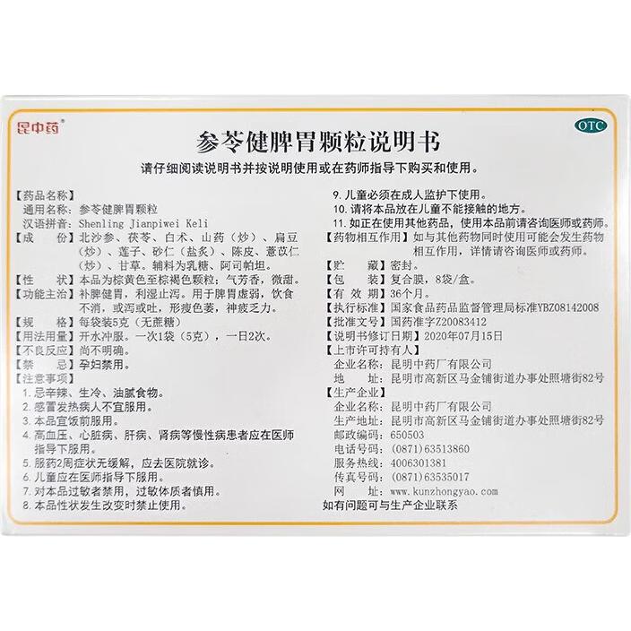 【昆中药】参苓健脾胃颗粒5g*8袋 无蔗糖补脾健胃饮食不消或泻或吐形瘦色萎神疲乏力含茯苓